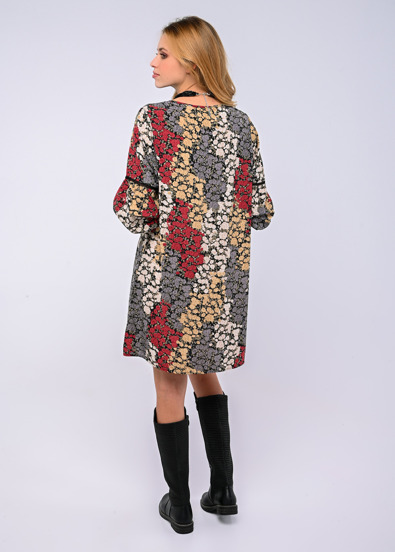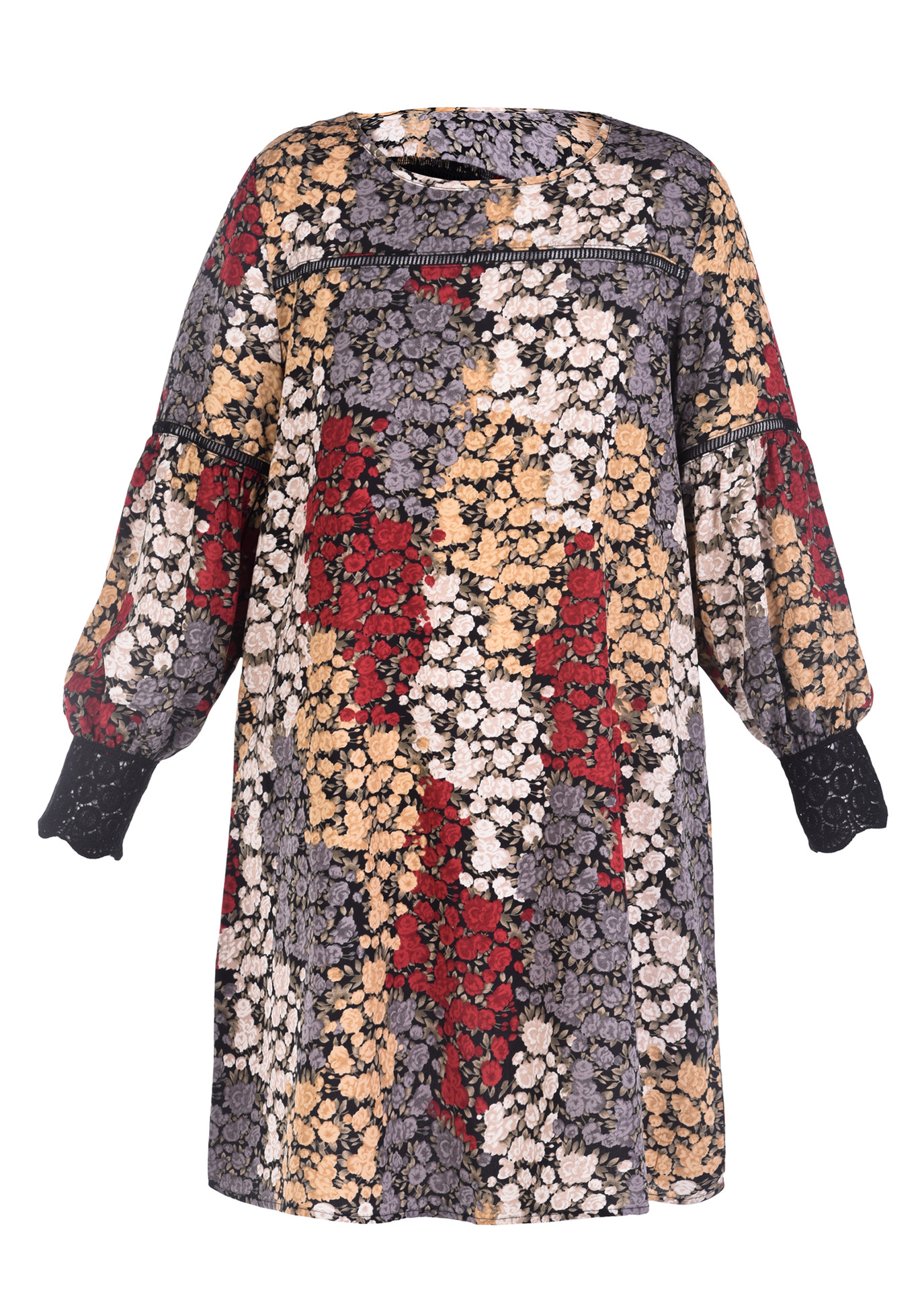 Vestido curto de manga comprida com decote redondo e aplicação de rendas nas mangas.